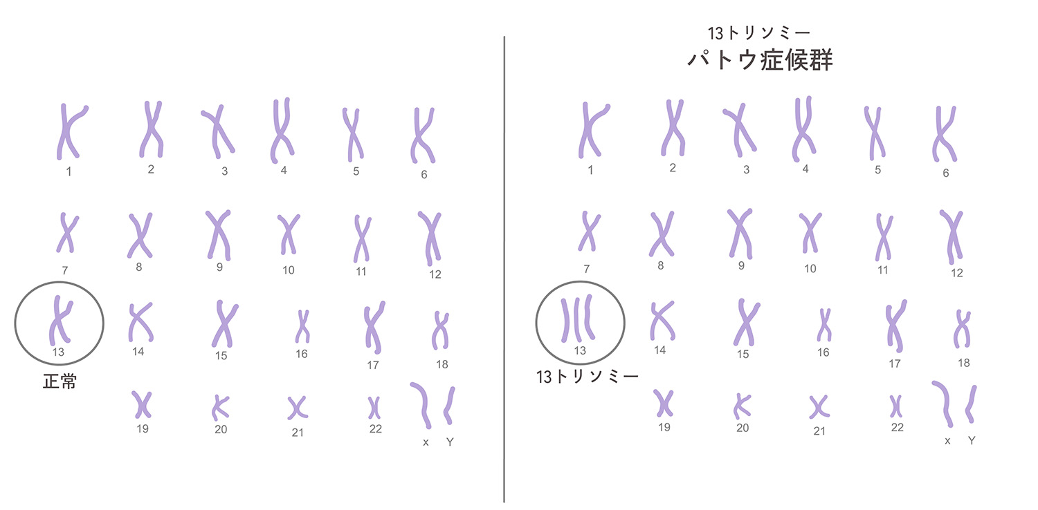 パトウ症候群(13トリソミー)は、13番目の染色体の異常分裂が原因で発生し、通常は2本である染色体が3本になることによって発生します。この染色体が1本多い状態のことをトリソミーと言い、13番目の染色体にこの現象が見られるため、パトウ症候群は13トリソミーとも呼ばれています。