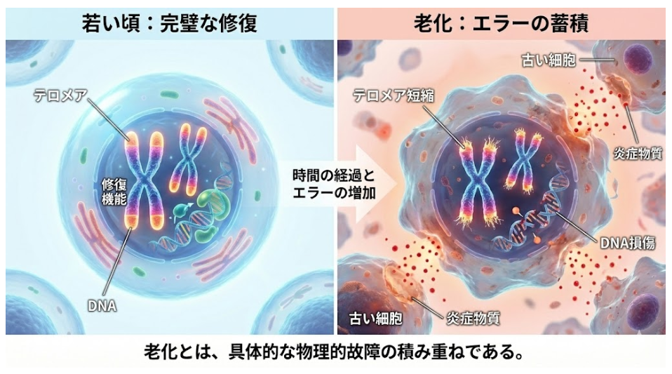 しかし、最新の分子生物学が定義する老化とは、曖昧な自然現象ではなく、細胞レベルで起きる具体的な物理的エラーの蓄積です[1]。